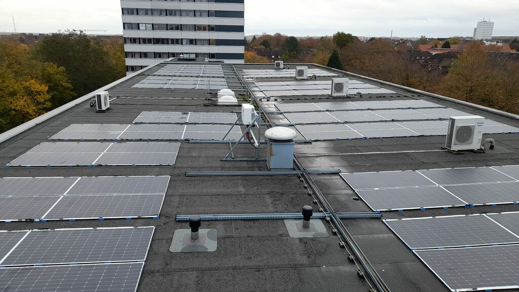 Wir übernehmen die Planung, Lieferung, Installation, Inbetriebnahme, Fernüberwachung, Optimierung und Wartung. Bei der Immobilie in Kiel handelt es sich um ein privates Bildungszentrum. 210 Module und 1 Wechselrichter wurden auf dem Flachdach montiert. Insgesamt ergibt sich eine Photovoltaik-Leistung von 79 kWp. Wir bedanken uns bei unserem Kunden und freuen uns, dass er durch das gemeinsam erfolgreich abgeschlossene Projekt in Zukunft 34,5 Tonnen CO₂ pro Jahr einspart und freuen uns auf eine weiterhin erfolgreiche Zusammenarbeit!